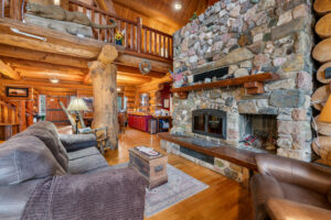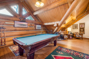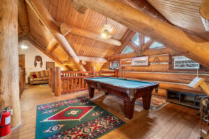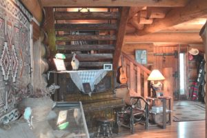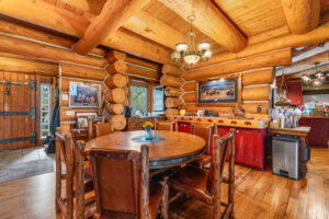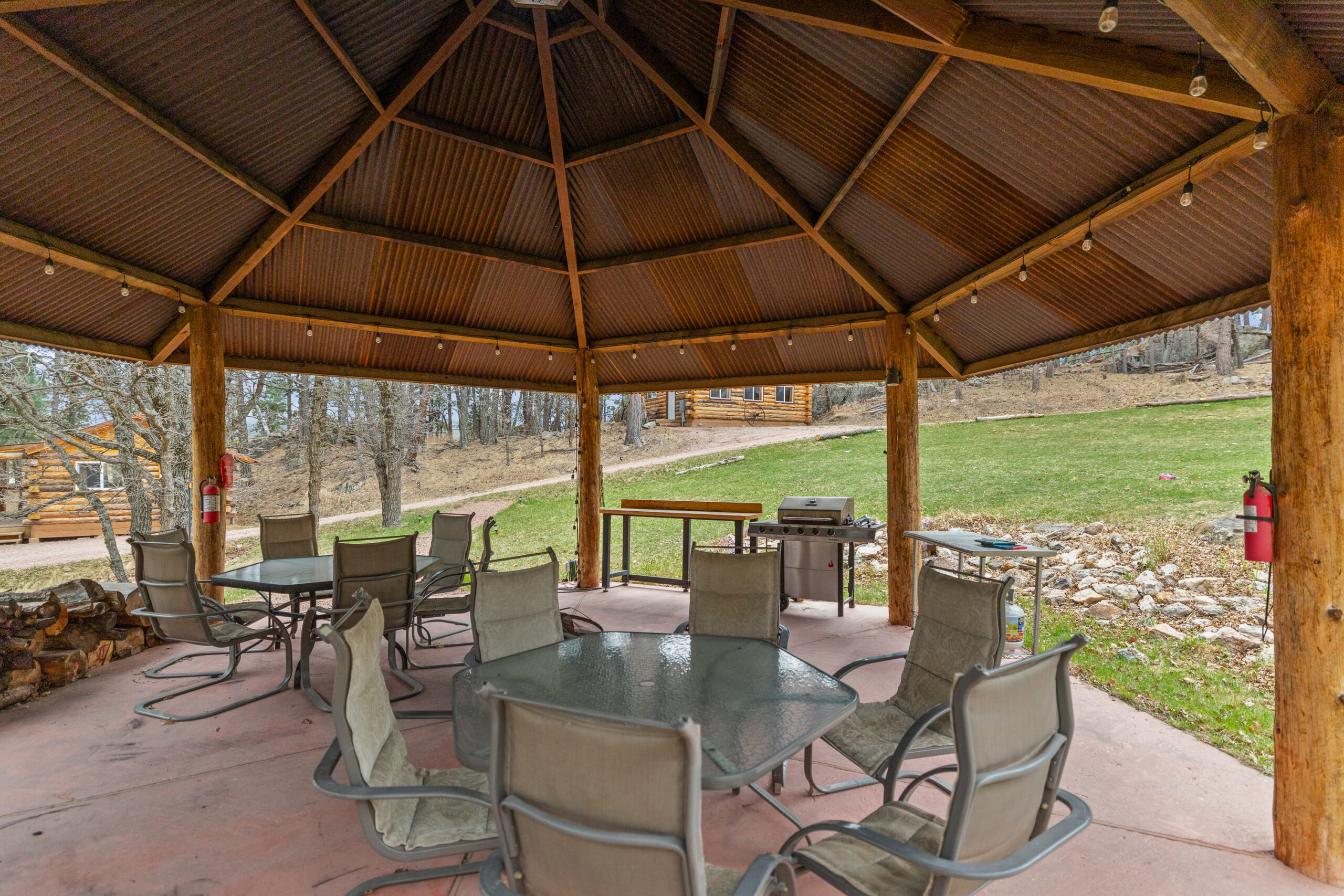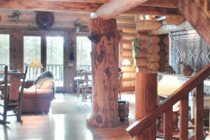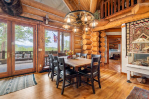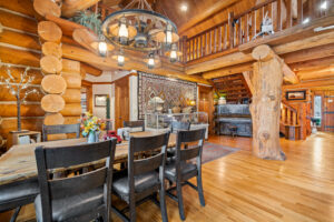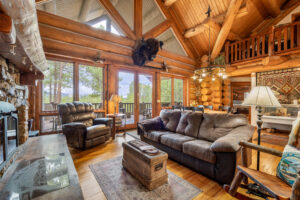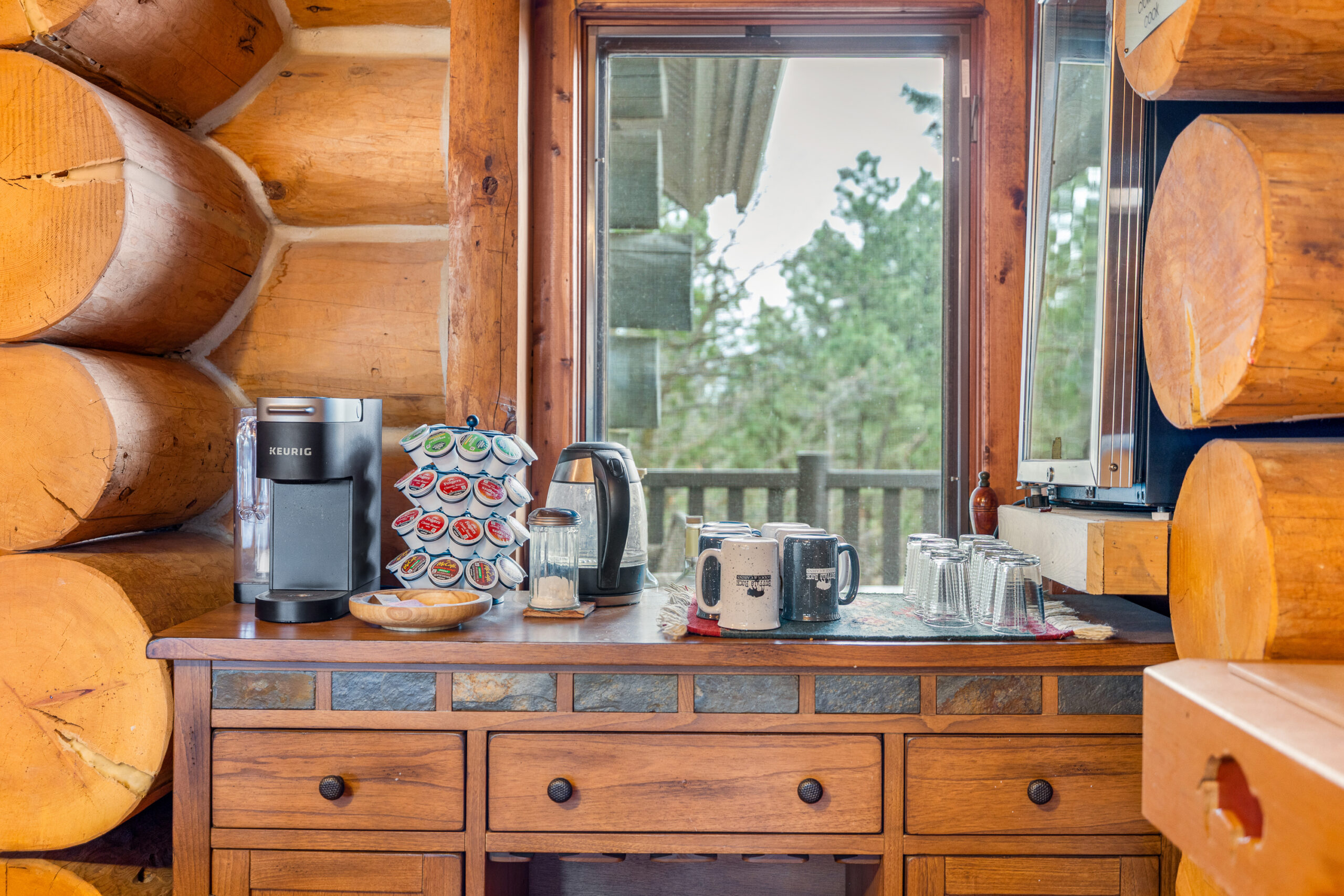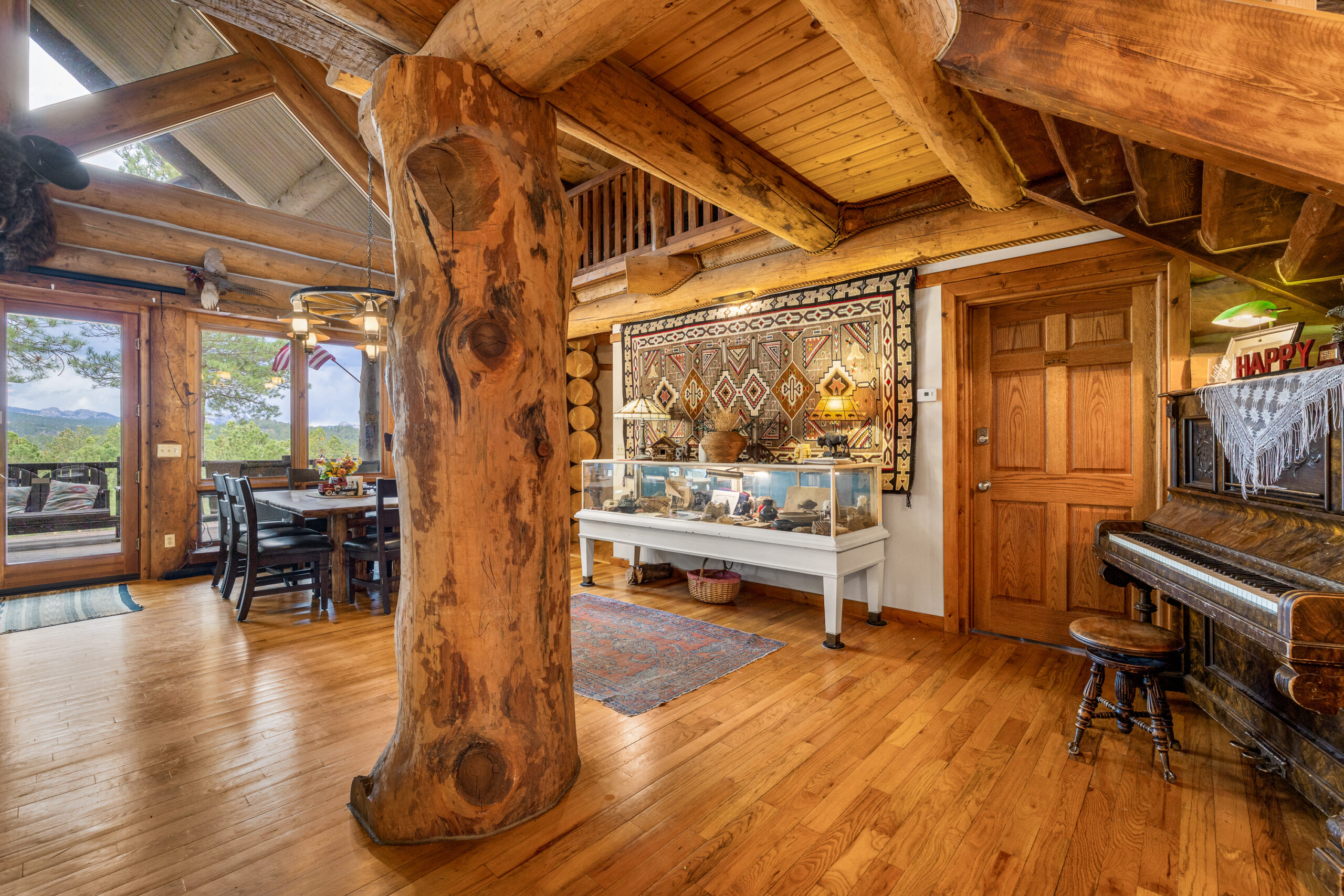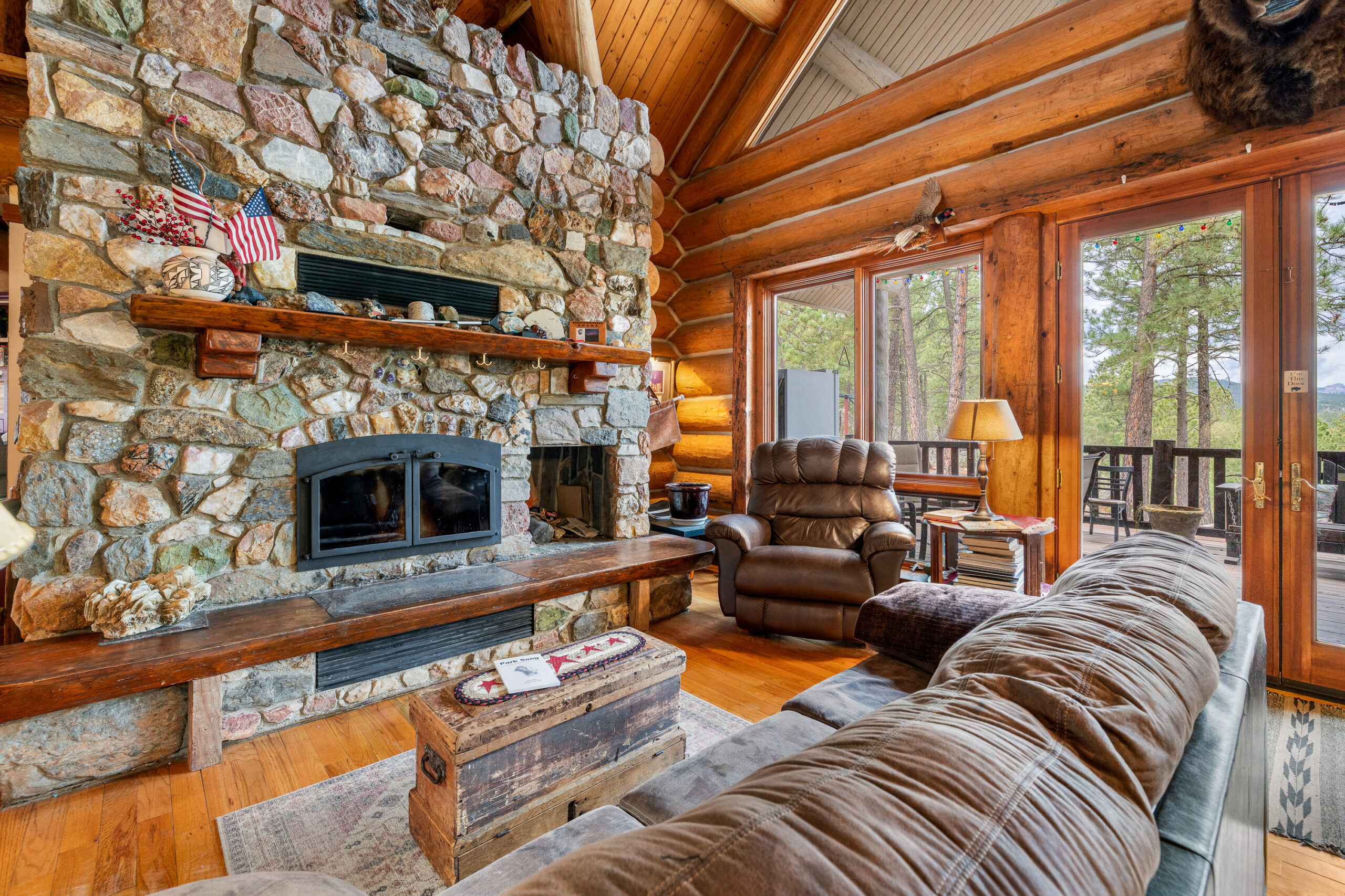 The lodge is constructed of massive spruce logs with an extensive deck facing west with views of pine trees, rock outcrops and Mt. Rushmore.