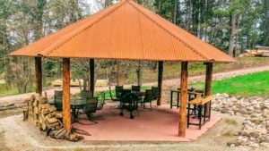Each cabin comes with its own dedicated, private bathroom in the shower house. For meal preparation, each cabin features a kitchenette unit with hot plate and refrigerator, and the centrally-located pavilion has a propane grill and fire pit for burgers and s’mores (food not included).