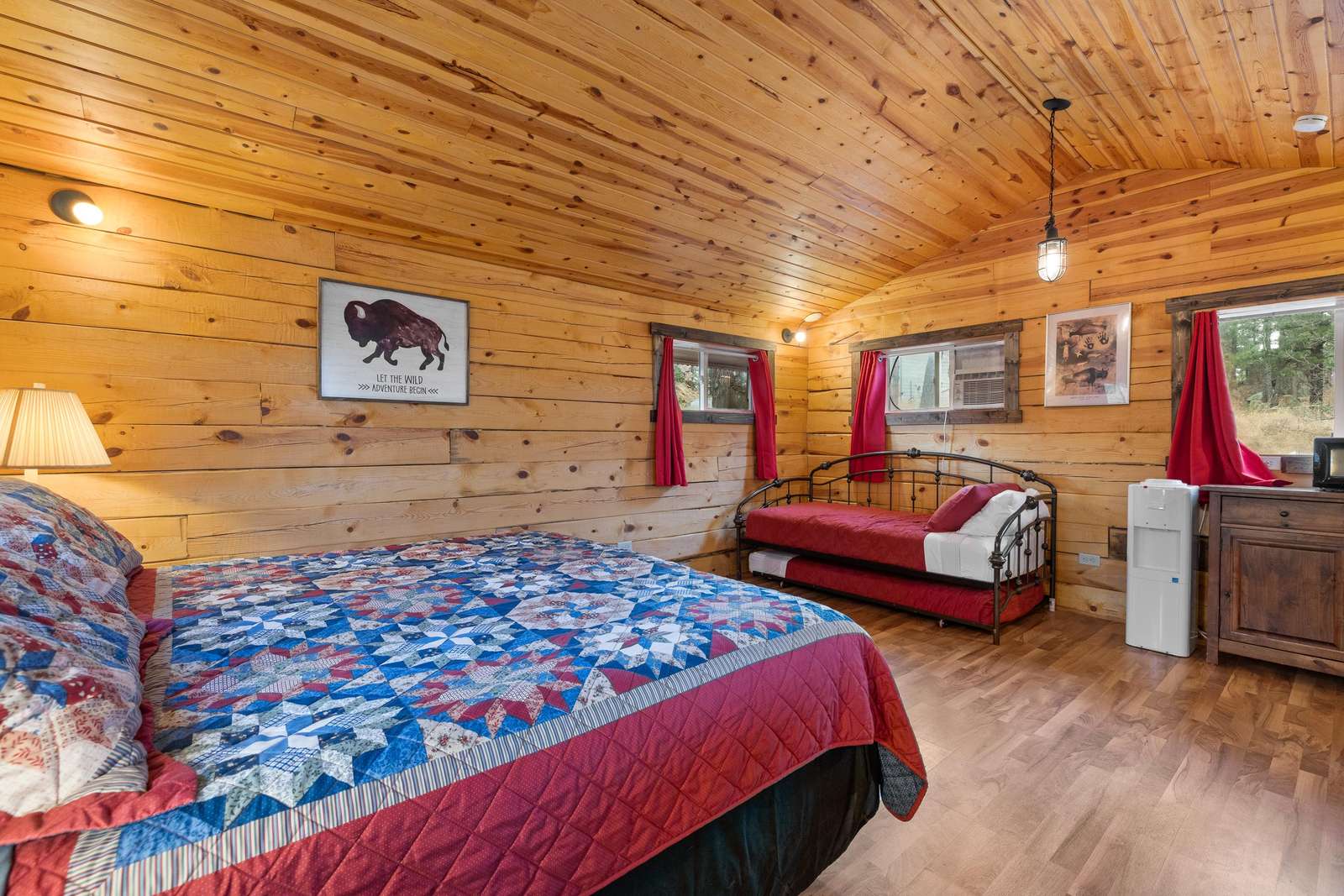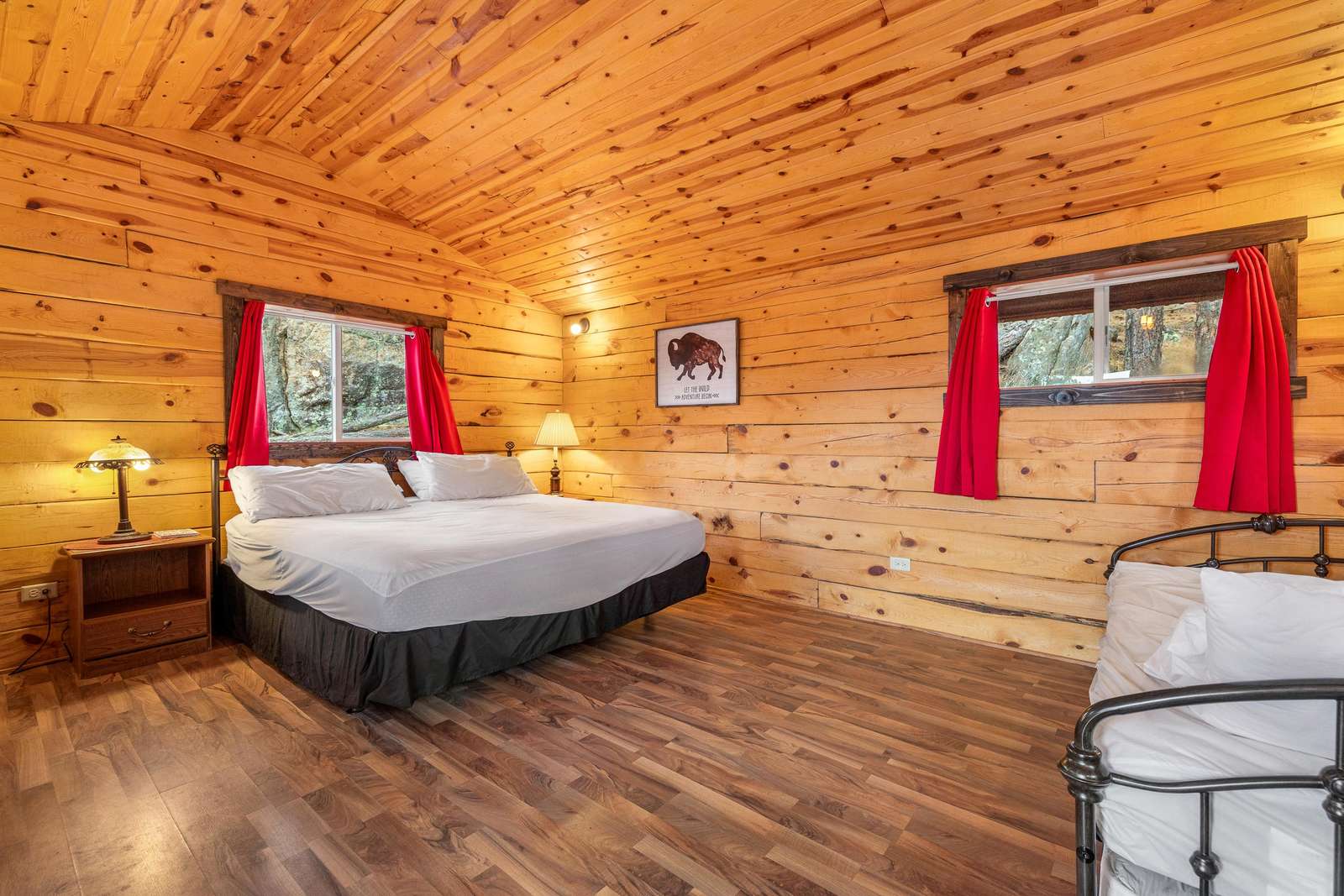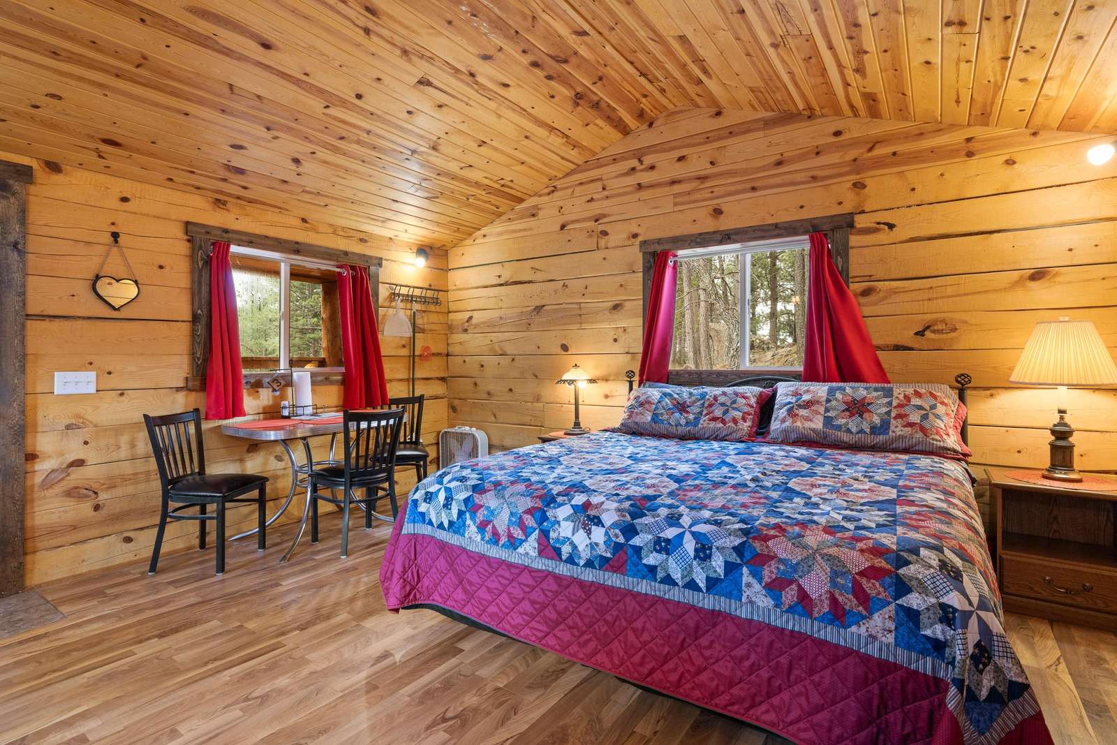 Outfitted with comfortable beds and seating areas, this cabin is perfect for getting out into nature, without being "too far" into nature. The cabin comes with its own dedicated, private bathroom in the shower house. For meal preparation, the cabin features a kitchenette unit with a hot plate and refrigerator, and the centrally-located pavilion has a propane grill and fire pit for burgers and s’mores (food not included). Our play area and nature trail offer kids a chance to unwind after a long day in the car. This furnished cabin sleeps up to four. It has a king bed and a dual-twin trundle bed. Just bring your own sleeping bag or blanket. We provide the rest!