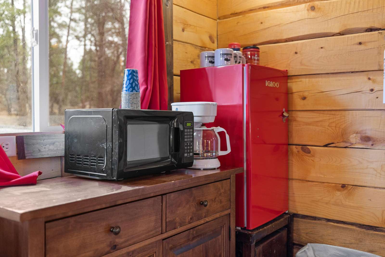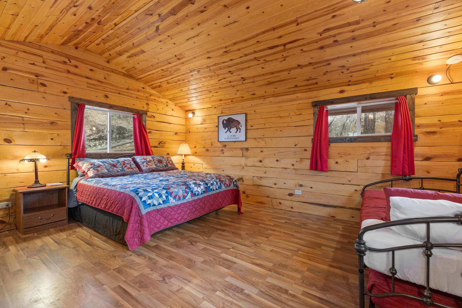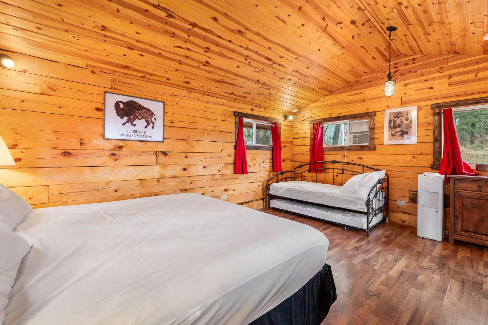 Outfitted with comfortable beds and seating areas, this cabin is perfect for getting out into nature, without being "too far" into nature. The cabin comes with its own dedicated, private bathroom in the shower house. For meal preparation, the cabin features a kitchenette unit with a hot plate and refrigerator, and the centrally-located pavilion has a propane grill and fire pit for burgers and s’mores (food not included). Our play area and nature trail offer kids a chance to unwind after a long day in the car. This furnished cabin sleeps up to four. It has a king bed and a dual-twin trundle bed. Just bring your own sleeping bag or blanket. We provide the rest!