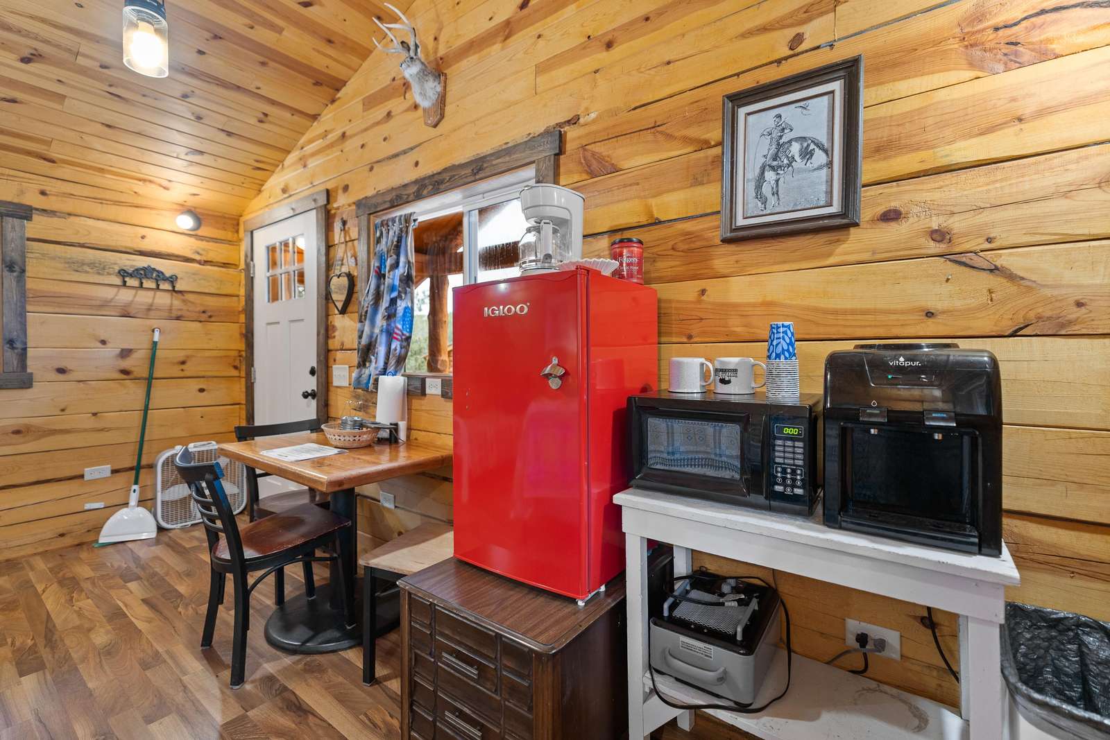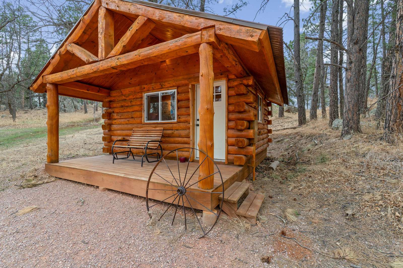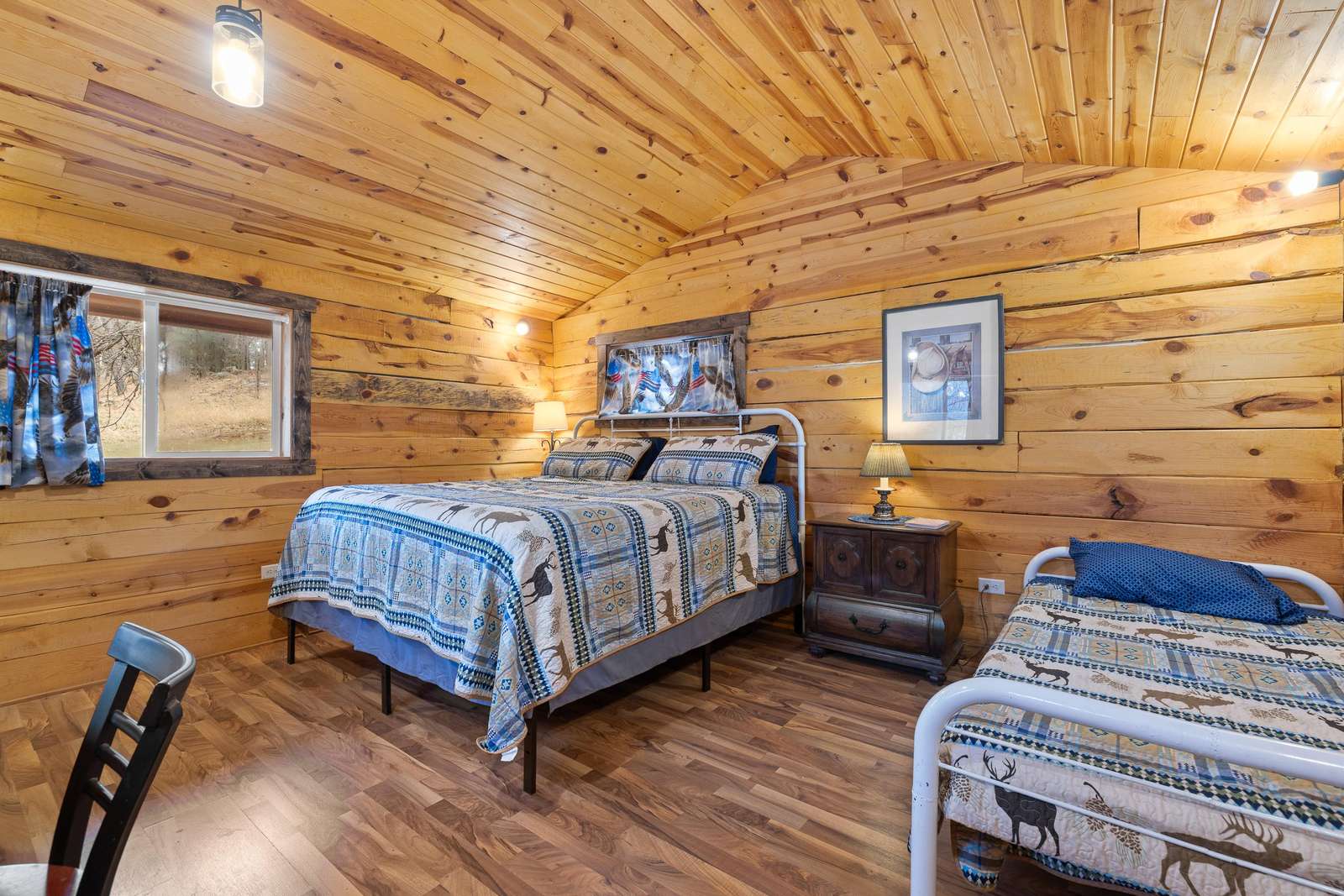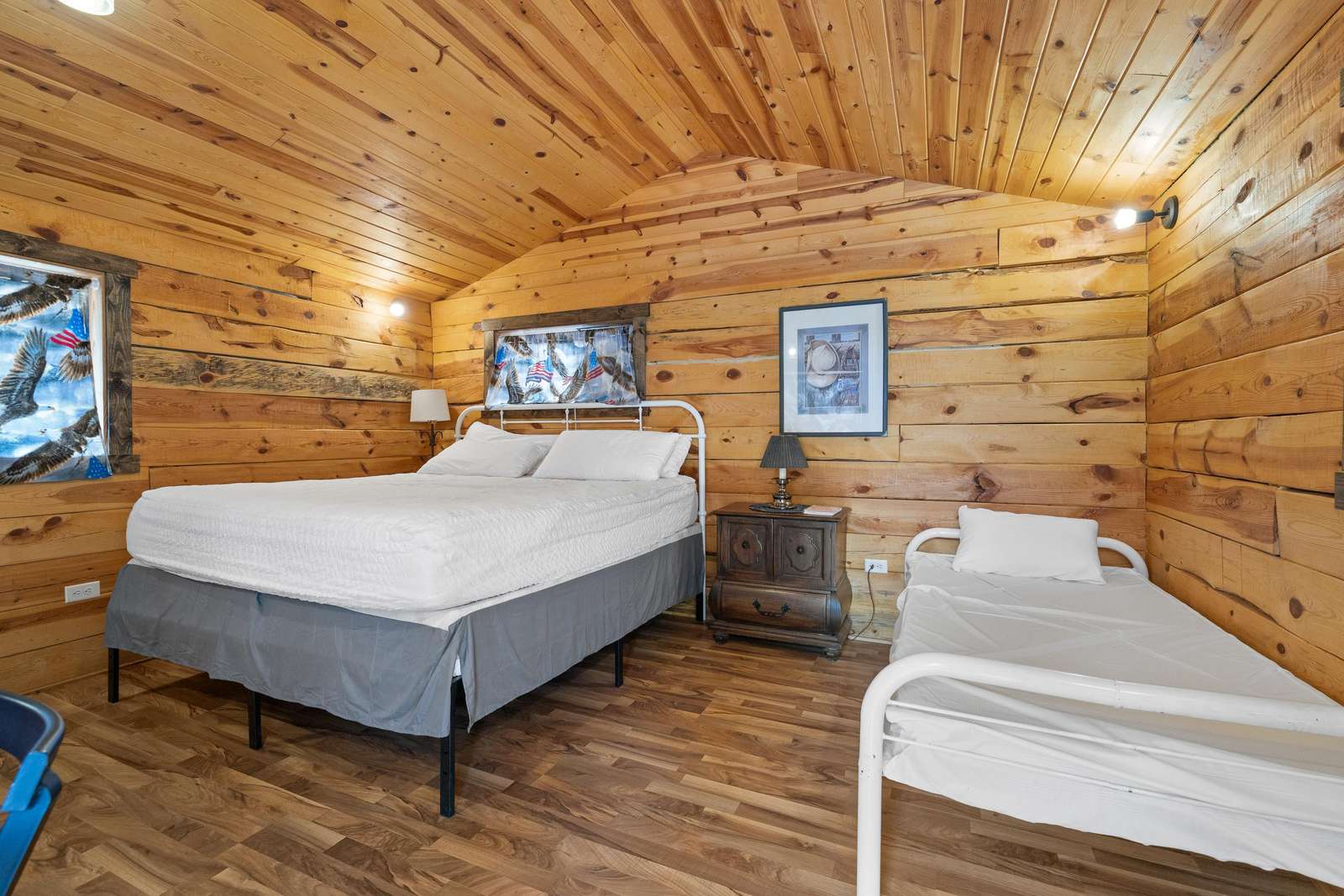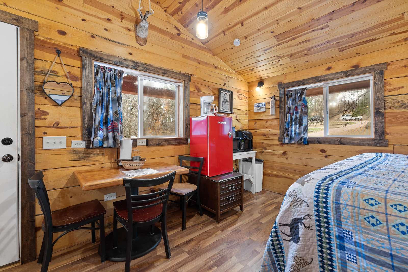 Outfitted with comfortable beds and seating areas, this cabin is perfect for getting out into nature, without being "too far" into nature. The cabin comes with its own dedicated, private bathroom in the shower house. For meal preparation, the cabin features a kitchenette unit with a hot plate and refrigerator, and the centrally-located pavilion has a propane grill and fire pit for burgers and s’mores (food not included). Our play area and nature trail offer kids a chance to unwind after a long day in the car. This furnished cabin sleeps up to three. It has a king bed and a twin bed. Just bring your own sleeping bag or blanket. We provide the rest!